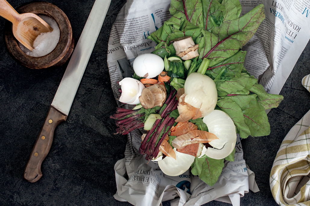 Eine Alternative ist, beim Kochen einfach ein Sammelbehältnis auf die Anrichte zu stellen, wie zum Beispiel einen Topf, eine Dose oder ein Glas. Nach dem Leeren und Aus waschen können sie immer wieder verwendet werden.